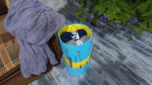 Текстильная корзина для хранения пряжи, спиц и крючков.