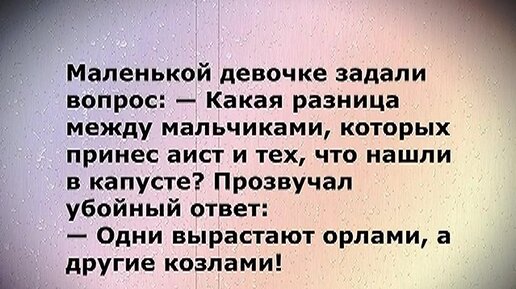 Маленькой девочке задали вопрос: - Какая разница между мальчиками, которых принес аист и тех, что нашли в капусте? Прозвучал...