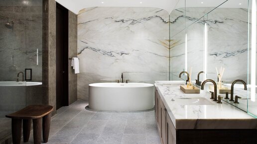 Отделка ванной керамогранитом под мрамор в серых тонах