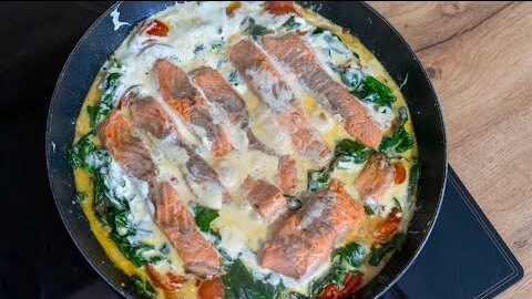 Нежнейшая красная рыба в сливочном соусе с томатами и шпинатом