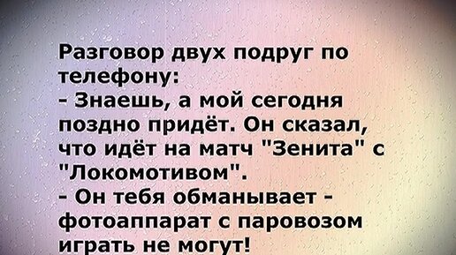 Разговор двух подруг по телефону: - Знаешь, а мой сегодня поздно придет. Он сказал, что идет на матч "Зенита" с "Локомотивом"...