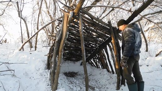 Строю зимой в лесу шалаш для ночёвок и рыбалок! Часть-2!