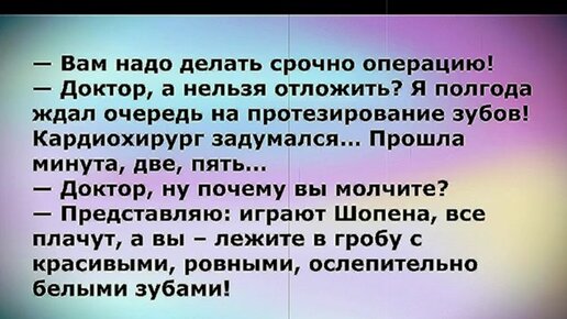 - Вам надо делать срочно операцию! - Доктор, а нельзя отложить? Я полгода ждал очередь на протезирование зубов! Кардиохирург...