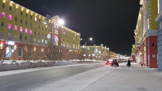 Центр Норильска в полярную ночь. Магазин Енисей, памятник металлургам, Норникель