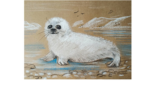 Белек - детеныш тюленя. Рисунок сухой пастелью на крафтовой бумаге.