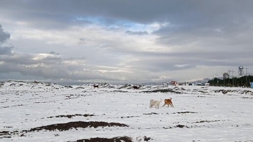 Собаки играют на снежном берегу