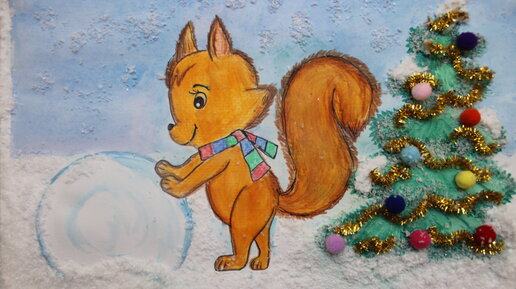 Простые зимние рисунки. Рисуем белочку со снежком.
