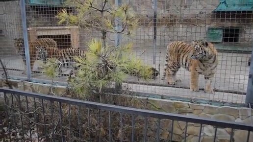Тигры внимательно наблюдают за кошкой, которая гуляет рядом с вольером