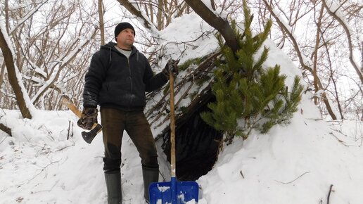Зимний шалаш в лесу для ночёвок и рыбалок! Часть-4! Всё готово!