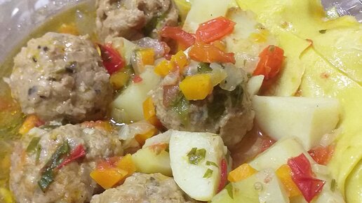 Покажу как приготовить картофель, тушёный с митболами (фрикадельками) под пельменным тестом