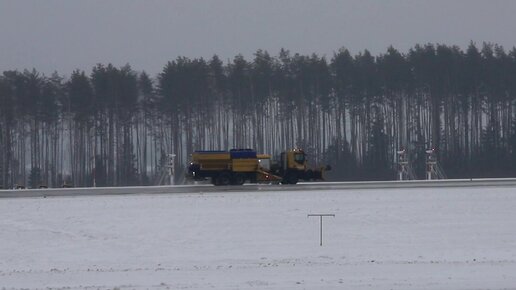 Обработка взлётно-посадочной полосы Национального аэропорта Минск противообледенительными реагентами.