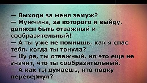 - Выходи за меня замуж? - Мужчина за которого я выйду должен быть отважный и сообразительный! - А ты уже не помнишь, как я...