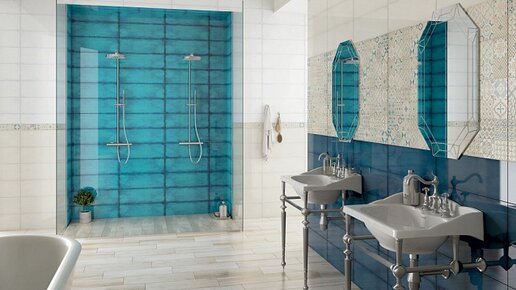 Бирюзовая кафельная плитка в интерьере ванной