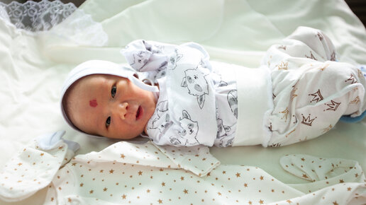 Малыша выписывают из роддома. Мальчика пеленают в красивую одежду