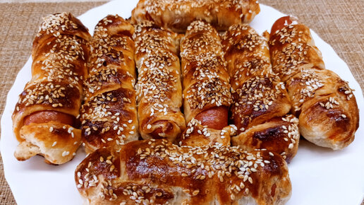 Сосиски в слоёном дрожжевом тесте с кунжутом.