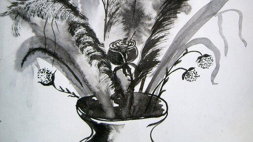 Графика. Интересно рисовать тушью по влажной бумаге и сухой кистью. Букет.
