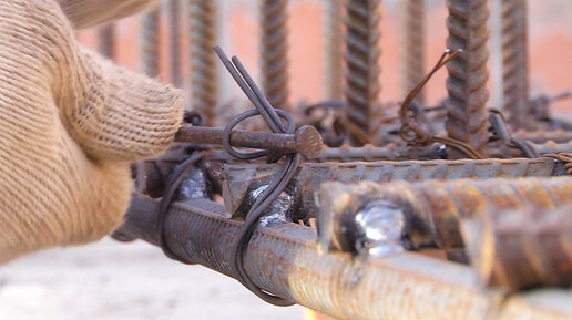 Вязка арматуры гвоздем крупным планом. Быстрое обучение.