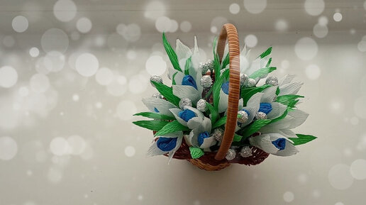 Подснежники из гофрированной бумаги в корзине//подарок к празднику