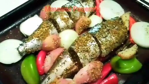 Вкусная скумбрия (любая рыба) с овощами в духовке. Там есть и картошечка. Ну в общем все как мы любим. Полезный ужин