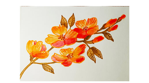 Рисунок ветки с оранжевыми цветами фломастерами и акварельными карандашами.