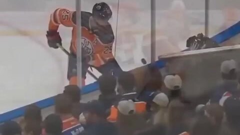 Никита Задоров мощным силовым роняет на лёд соперника, который потом наносит ему грязный удар в спину...