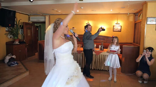 Невеста поёт песню для жениха на свадьбе. Кто за наше счастье, поднимите руки!