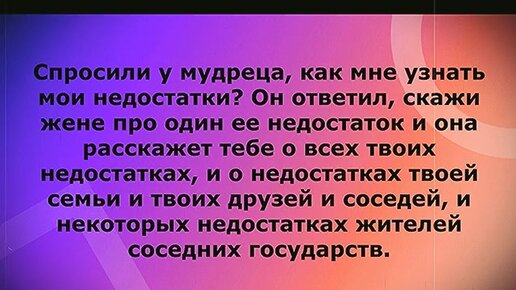 Спросили у мудреца, как мне узнать мои недостатки? Он ответил, скажи жене про один ее недостаток и она расскажет тебе о всех...