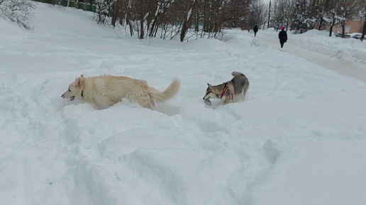 БШО и щенок хаски гуляют: Близард отгрызает ветки от куста, Бетси стащила у хозяйки варежку