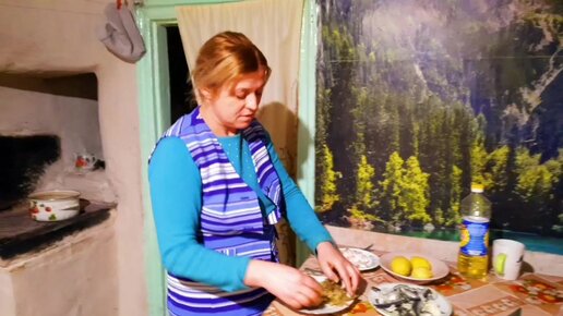 На столе картошка в мундире , сало , хамса с лучком и уксусом . За окном снег , мороз , кошки греются в доме .