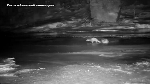 Стая выдр резвится на замёрзшей реке