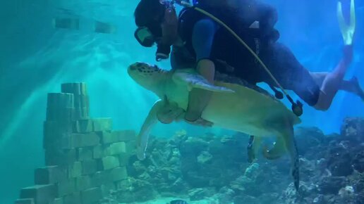 Ейск. Акулий риф. Черепаха всегда следует за дайвером. Помогает ему работать и позирует.