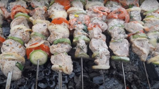 Морозным зимним днем мой муж балует нас вкусным шашлыком из вырезки свинины и овощей