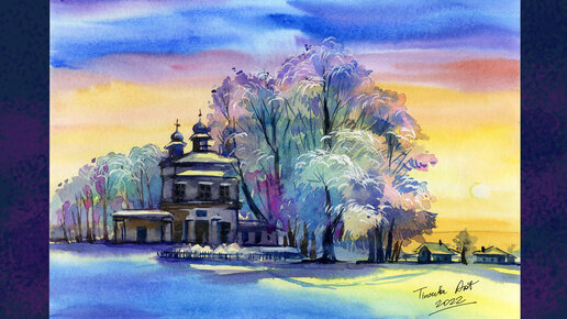 Рисуем церковь на фоне заснеженных деревьев, зимний пейзаж на закате солнца акварелью