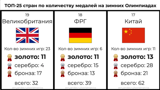 ТОП-25 стран по количеству медалей на зимних Олимпиадах. Угадаете лидера?