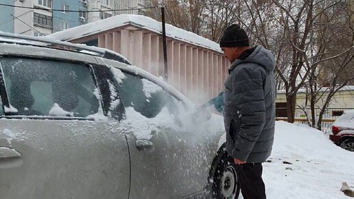 Воздуходуйка против снега на машине.