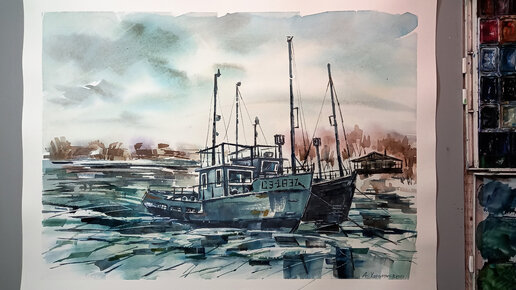 Хмурый Волхов ломает лед, рисуем акварелью
