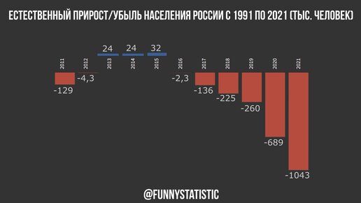 Естественный прирост/убыль населения России (1991-2021)
