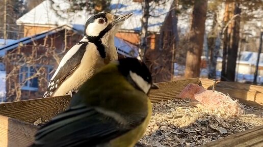 Что едят птицы? Дятлам мальчикам сало, девочкам семечки | Щеглы протиснулись между синиц и поползней.