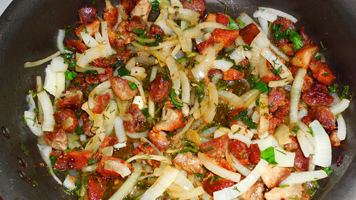 Жареная свинина на сковороде с маринованным луком.