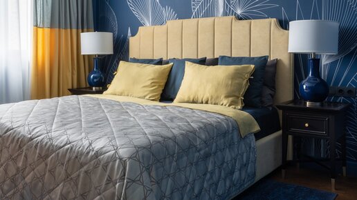 Эффектный интерьер спальни в сине-желтых цветах. Решились бы на такие акценты?