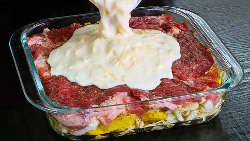 Сытный мясной рецепт с нежным соусом и картофелем в духовке