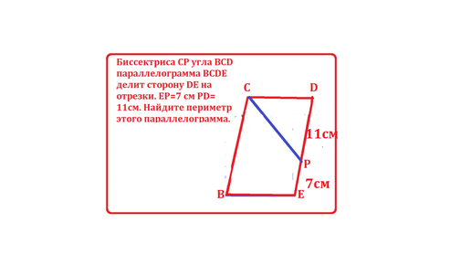 Биссектриса CP угла делит сторону DE на отрезки. Найти периметр параллелограмма BCDE