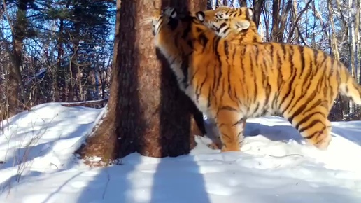 Тигры на прогулке попали в объектив камеры установленной в заповеднике