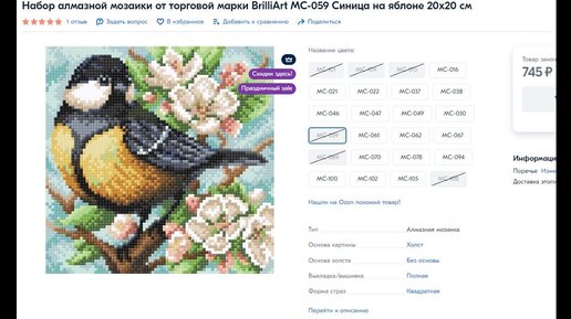 Хобби жены - "Алмазная мозаика" с Озона BrilliArt MC-059 Синица на яблоне 20х20 см