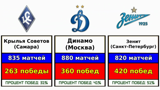 ТОП-31: рейтинг футбольных клубов России по количеству выигранных матчей с 1992 по январь 2022 года