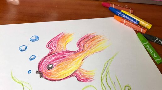 Рассказываю, как нарисовать золотую рыбку с помощью восковых мелков. Попробуйте с детьми