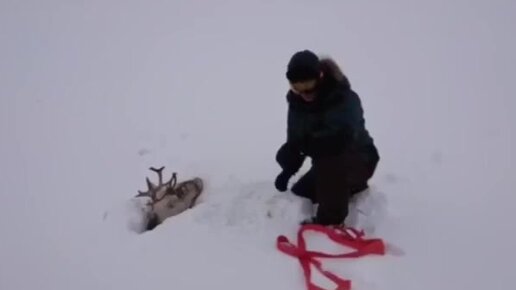 В Ижме олень провалился под снег по голову и мужики спасли его.