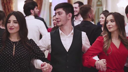 Красавицы девушки и могучие мужчины танцуют на свадьбе