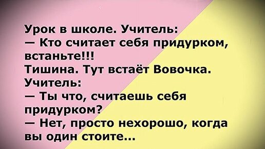 Урок в школе. Учитель: - Кто считает себя придурком, встаньте!!! Тишина. Тут встает Вовочка. Учитель: - Ты что, считаешь себя...