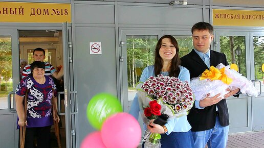 Счастливый папа встречает свою новорожденную доченьку и любимую жену на выписке из роддома